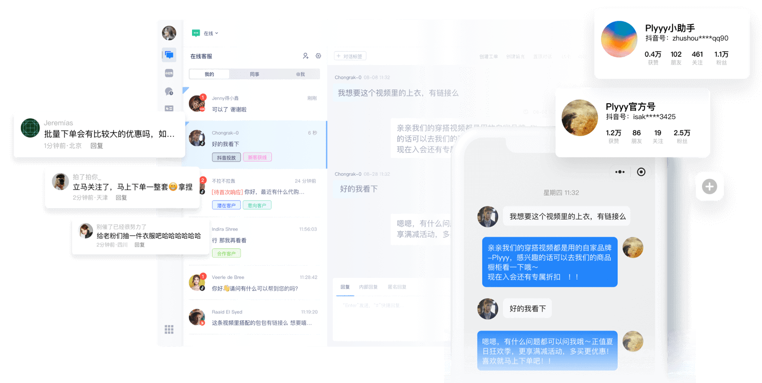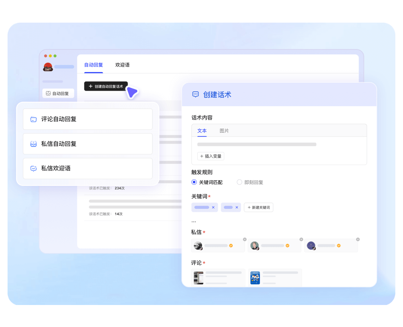 设置话术,触发关键字,自动、快速回复,支持团队协作,账号运营,提高效率,详尽数据统计,一目了然,挖掘更多用户意向