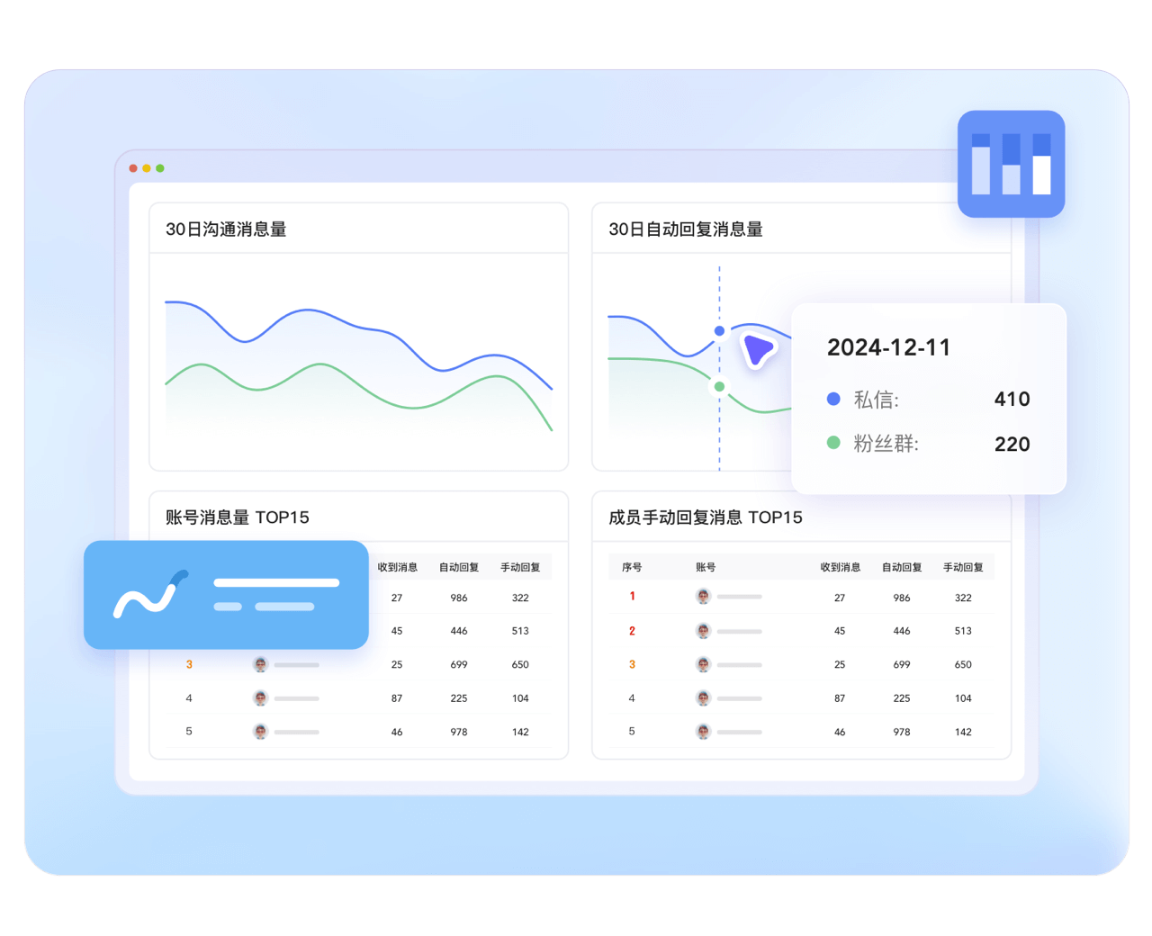 支持消息回复量的趋势和排名统计,账号统计,私信、评论人数趋势一目了然